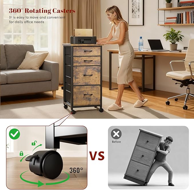 - 【Multi-Functional & Stylish】This file cabinet features a thick solid wood top and a sturdy steel frame — the top can hold a printer stand, while its 4 fabric drawers provide ample space for storing your office supplies and daily necessities. The cabinet can be placed under your desk (to store extra paper) or used as a storage cabinet in the living room. It boasts versatile style that fits various decors, and more usage scenarios await your exploration