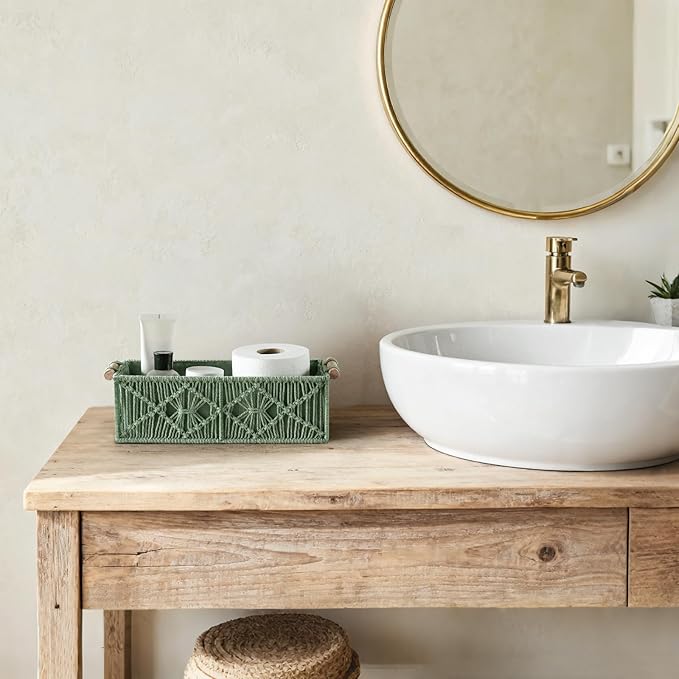 Mkono Macrame Storage Baskets Boho Decor Box Handmade Woven Decorative Countertop Toilet Tank Shelf Cabinet Organizer for Bedroom Livingroom Home, Set of 2, Green
