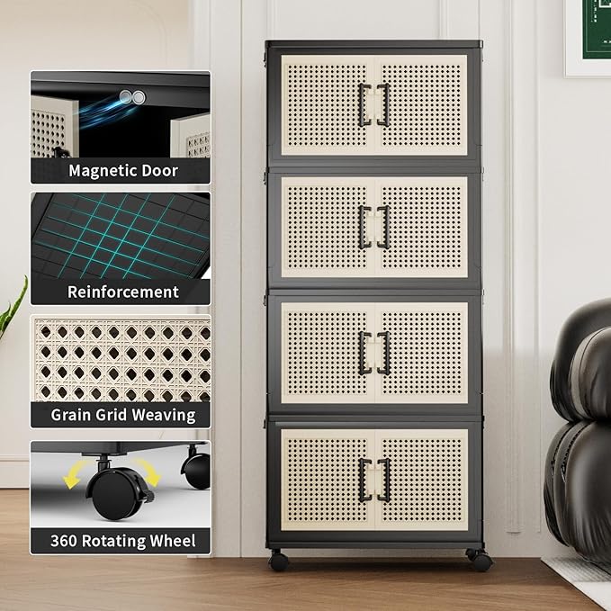 Stackable Storage Bins with Lids,Collapsible Plastic Storage Box Closet Organizers and Storage with Wheels and Magnetic Door for Home Office Dorm (4 Pack)