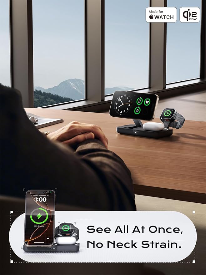 - Apple MFi Certified: Built with Apple-authorized chips, this iPhone charging station works seamlessly with iPhone 17/16/15/14/13/12/11/X/8, Apple Watch, and AirPods—no compatibility errors, even after iOS updates. Delivers up to 5x faster charging vs. non-certified chargers, while protecting 100% battery health and avoiding system update charging failures.A safer phone charger stand you can trust.