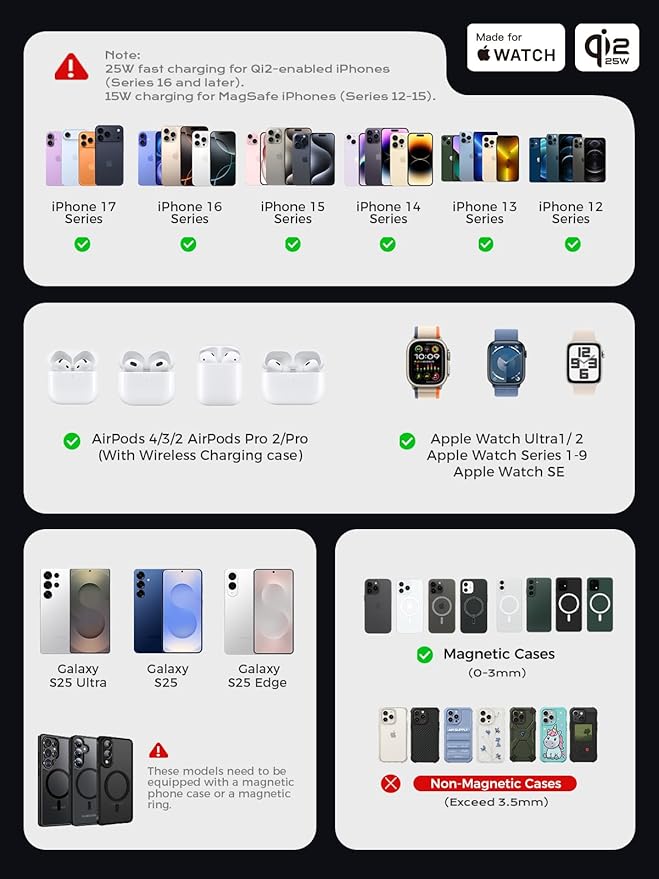 - Special Feature : 2025 Qi(Qi2.2) 25W Fast Charge, 36-Month Extended Warranty, Dual NTC Temperature Control System, Foldable and Portable, MFi Certified by Apple 2025 Qi(Qi2.2) 25W Fast Charge, 36-Month Extended Warranty, Dual NTC Temperature Control System, Foldable and Portable, MFi Certified by Apple