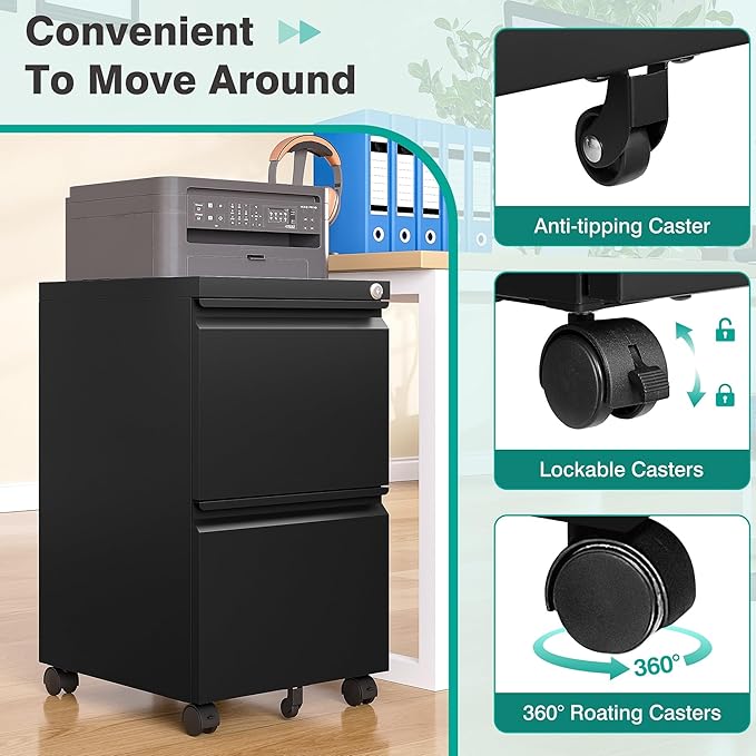- ✔️【MOBILE DESIGN】: 2 drawer metal file cabinet with lock equipped with 360-degree rotating wheels and lockable casters for smooth mobility,one center caster to prevent tipping,perfect for under-desk storage or moving between workspaces
