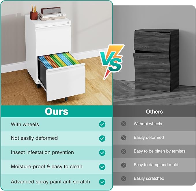 - ✔️【MOBILE DESIGN】: 2 drawer metal file cabinet with lock equipped with 360-degree rotating wheels and lockable casters for smooth mobility,one center caster to prevent tipping,perfect for under-desk storage or moving between workspaces