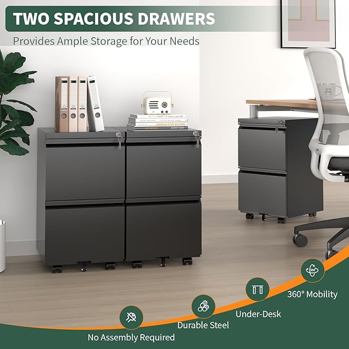 2 Drawer File Cabinet with Lock,Under Desk Rolling Small Filing Cabinet for Home Office Storage, Mobile Steel Cabinets with Wheels, Fully Assembled, Black