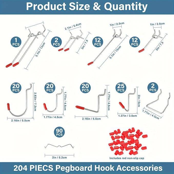 - 204-piece pegboard hooks set for versatile garage, workshop, and tool organization, compatible with 1/4" and 1/8" pegboard holes. Ideal pegboard accessories for hanging tools, small items, and creating a clutter-free workspace.