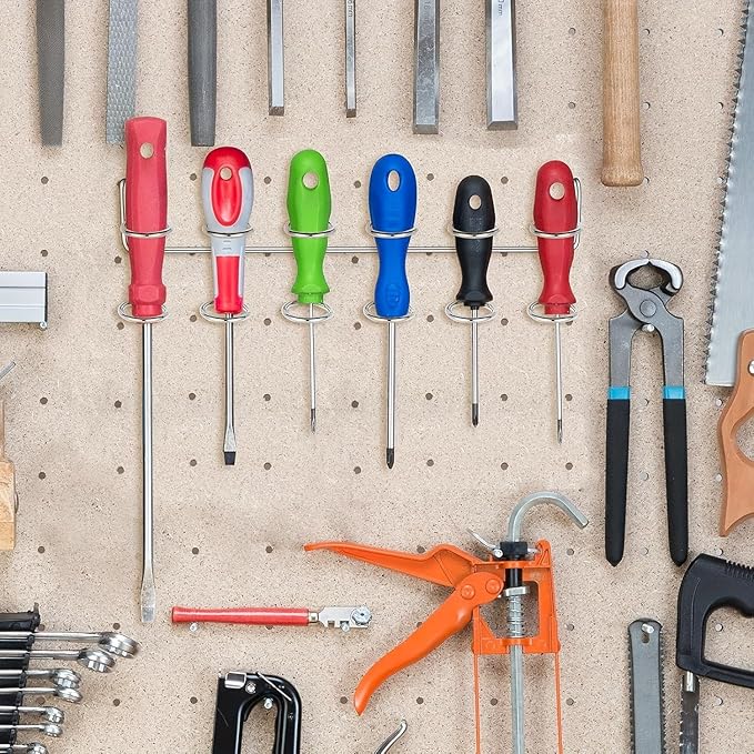 - Includes various sizes (2", 4", 6") of pegboard hooks L-shaped and straight designs for flexible tool hanging. Great peg board screwdriver organizer and pegboard bins for efficient storage solutions.