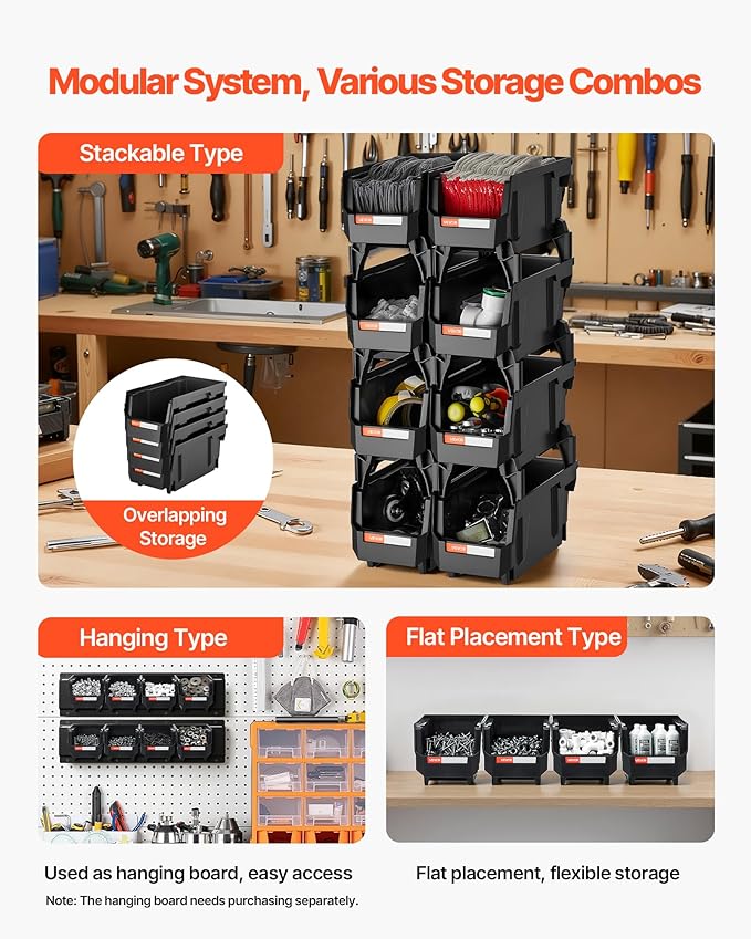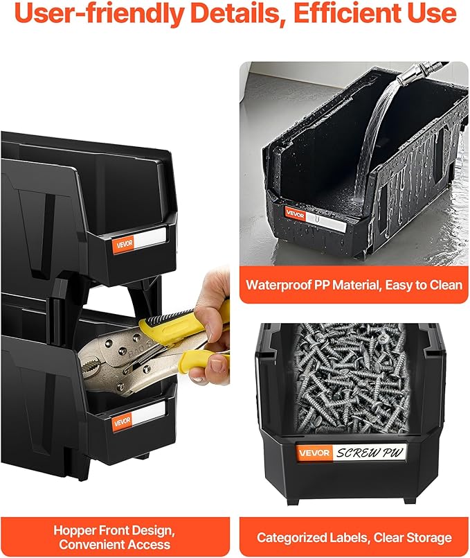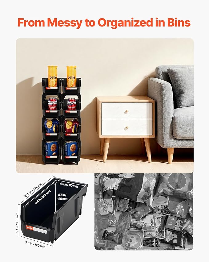 VEVOR Plastic Stackable Storage Bins, 10.9 x 5.5 x 5.1 inch (8 Pack), Plastic Containers for Organizing and Storage Bins for Closet, Garage, Small Parts, Office Supplies and Other Accessories, Black