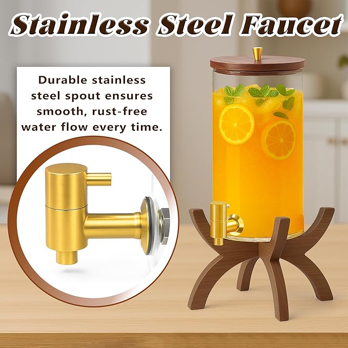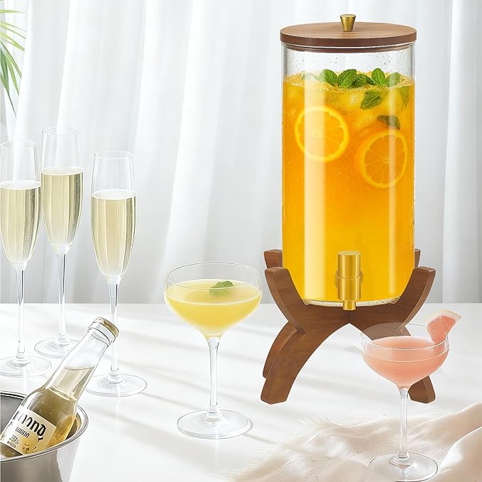 - 【Crystal-Clear Glass & Natural Wood Base】Crafted from thick, lead-free glass, this dispenser beautifully showcases colorful beverages and fruit slices. The solid wood stand adds stability and a touch of organic warmth, creating a centerpiece that complements both modern and rustic décor.
