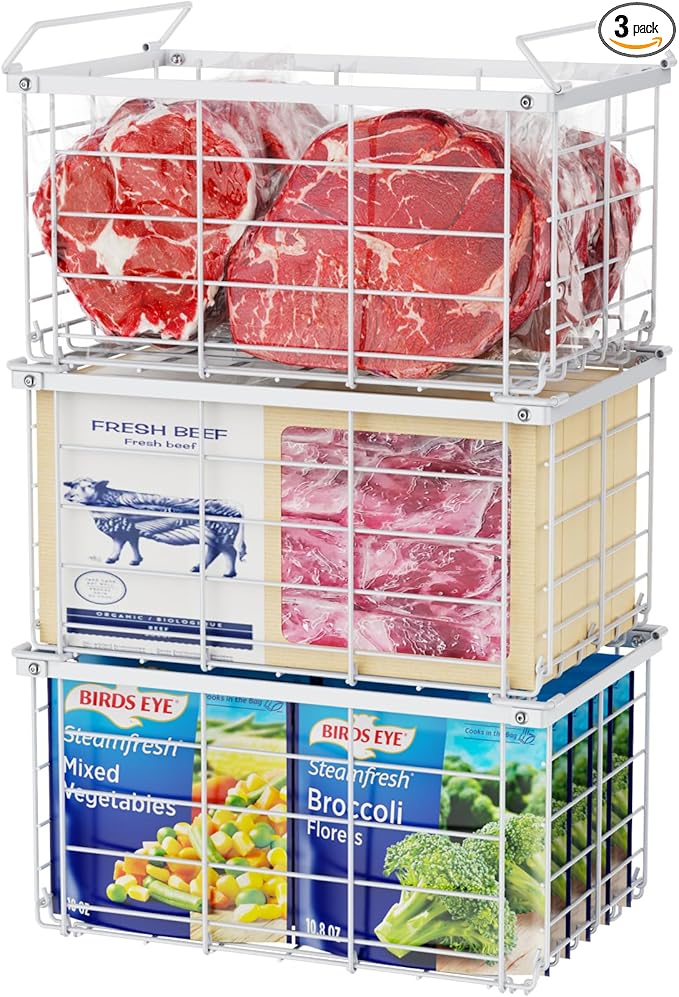 iSPECLE Deep Freezer Organizer Bins - 3 Pack Large Freezer Organizer Bins for 5 to 7 Cu.Ft Chest Freezer, Stackable Easy Access Food No More Digging, Sturdy Metal Wire Basket Not Scratch Bottom, White