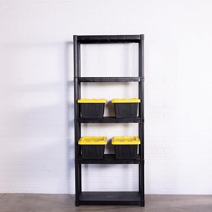 Plastic 5-Gallon Storage Tote with Lockable Lid, Stackable Tough Regular-Duty Bin for Garage, Tools, and Home Organization (4-Pack) - Black and Yellow
