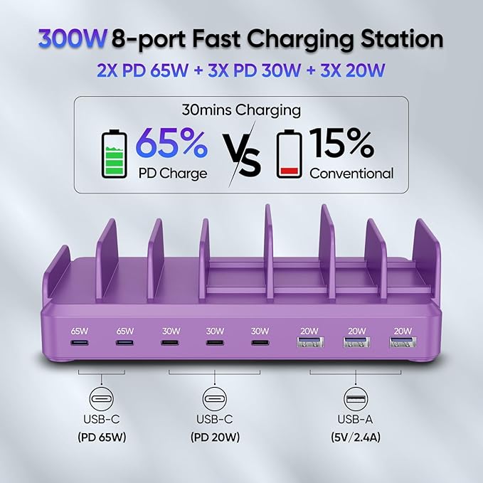 300W Charging Station for Multiple Devices, 8 Port Multi USB C Fast Charger Station Dock for MacBook iPhone 16/15/14/13/12 Samsung Pixel Series iPad, Purple (6 Mixed Short Cables Included)