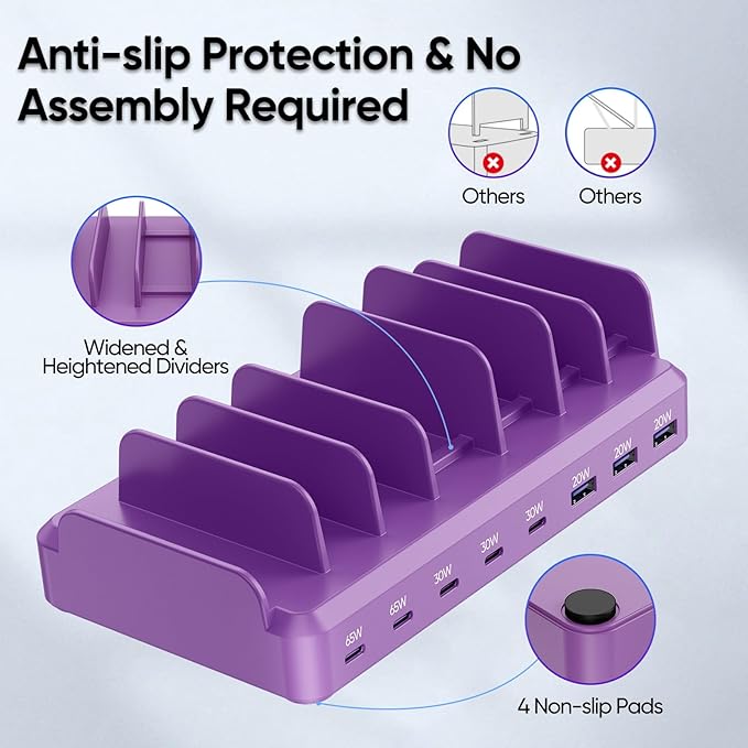 - 8 Port Charging Station for Multiple Devices: Our multi charging station comes with 5 USB-C ports to accommodate modern devices compared to those charging stations which only have USB-A ports. This charging dock shares a total output up to 300W with dual 65w ports to charge laptops. Its extra 30w and 20w ports can power tablets and smartphones.