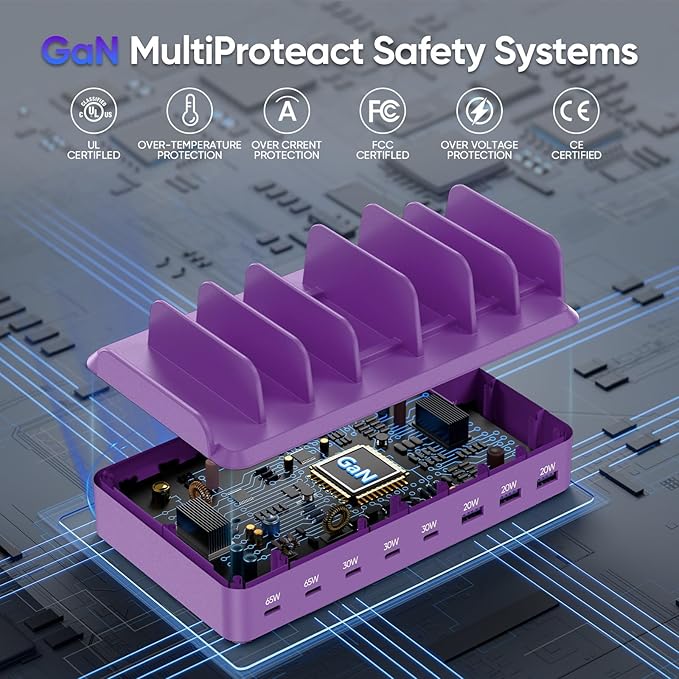 - Powerful Multiport GaN Charger: This multi device charging station can significantly meet your daily charging needs. Dual 65W ports can power your laptops like MacBook Pro/ Air, etc. 30W and 20W can work great as fast charger for iphone 16/ 15 pro/ 15 promax/ galaxy S23/ ultra, ear pods, kindle, iwatches, etc.