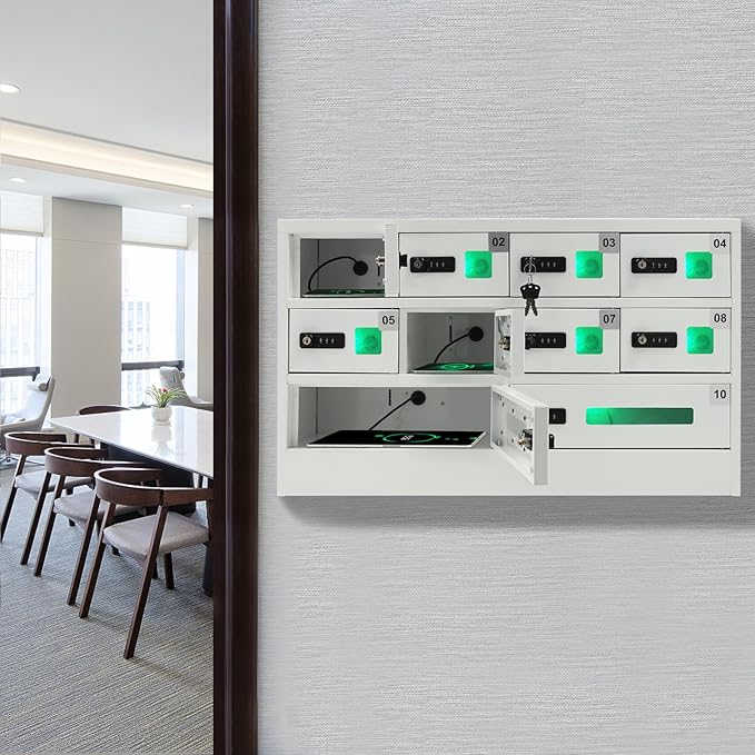 10 Slot Cellphone Charging Station Cell Phone Locker with Combination Lock, Cellphone Storage Cabinet with 3 in 1 QC3.0 Fast Charging Ports for Most Phones Tablets, for Office Classroom