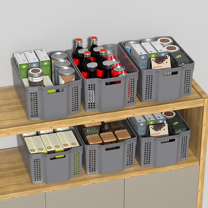 12-Pack Large Plastic Storage Baskets, Deep Stacking Storage Basket Bin, Open Cupboard Basket for Pantry, Grey