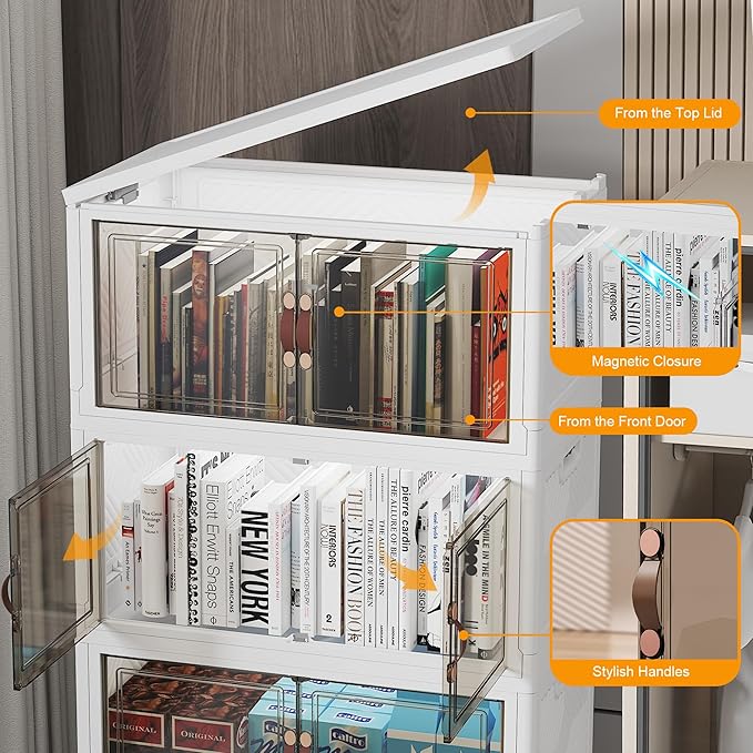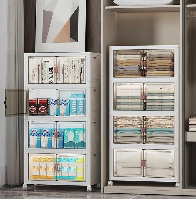 - 4. FRONT DOOR & TOP LID FOR EASY ACCESS: Front door for instant item retrieval; top lid for full coverage. No lifting or unstacking required. Note: these closet organizers come with 2 LIDS.