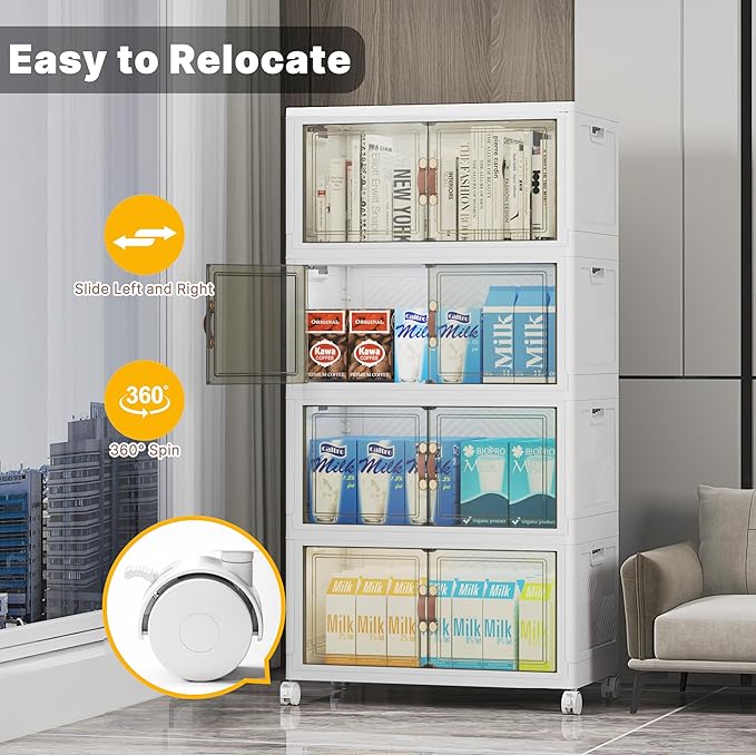 440Qt Stackable Storage Bins with Lids, 8 Pack Collapsible Bins with Wheels, Plastic Cabinet with Doors, Foldable Closet Organizers and Storage for Home, Dorm, Office, White