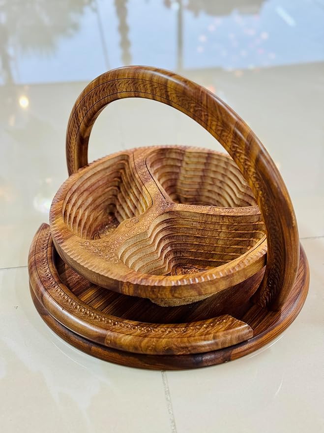 Handmade 12″ Collapsible Wooden Basket, 3-Compartment Angel Wings Design in Himalayan Rosewood, Fruit Basket, Bread Bowl & Trivet, Folds Flat for Easy Storage – Unique Centerpiece & Gift