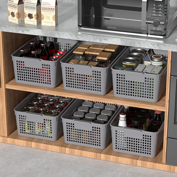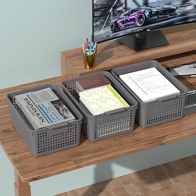Sandmovie 12-Pack Plastic Storage Basket Desktop Organizer, Large Storage Baskets, Gray