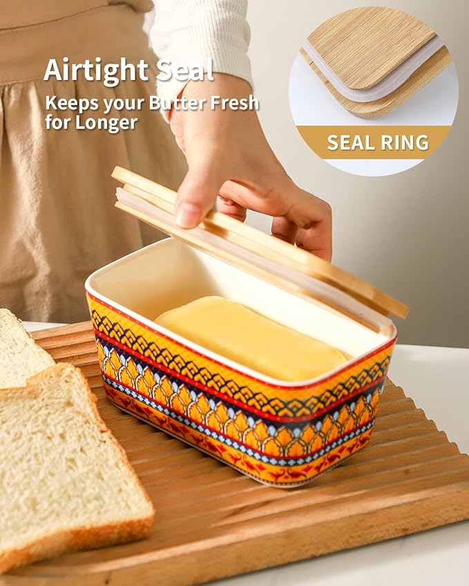 Hasense Bohemian Butter Dish, Farmhouse Ceramic Butter Dish with Lid for Fridge, Butter Container Holder with Cover or Fridge,Silicone Sealing, Holds Two Sticks of Butter, Yellow