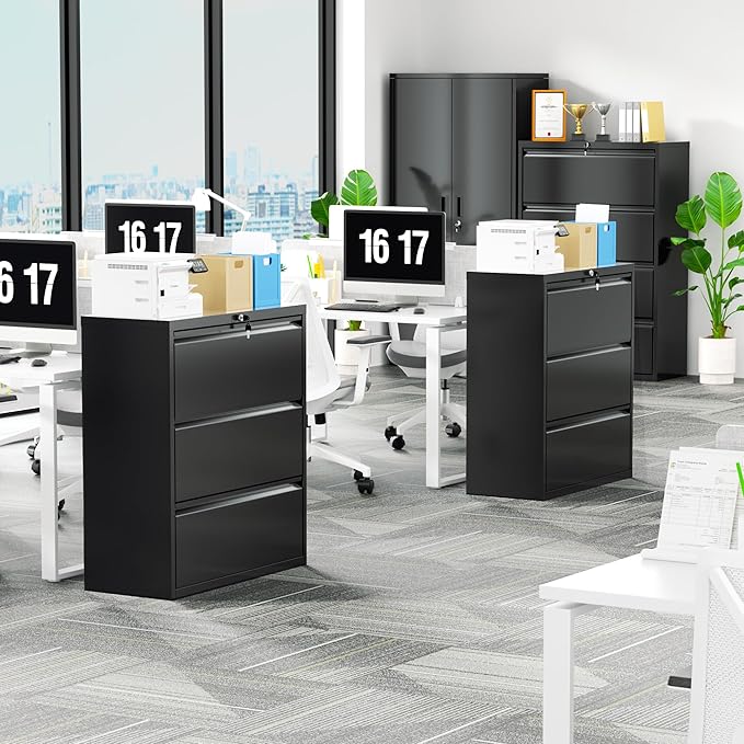 Bonusall 3 Drawer Lateral File Cabinet with Lock, Locking Metal lateral Filing Cabinet for Office Steel lateral File Cabinet, Large Horizontal File Cabinet Locked by Keys-Black