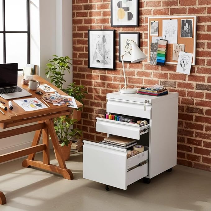 - Versatile 3-Drawer Storage:This mobile file cabinet features two utility drawers for office supplies and one deep file drawer that fits Letter, Legal, and A4 hanging folders, helping you keep documents and essentials neatly organized in one compact unit.