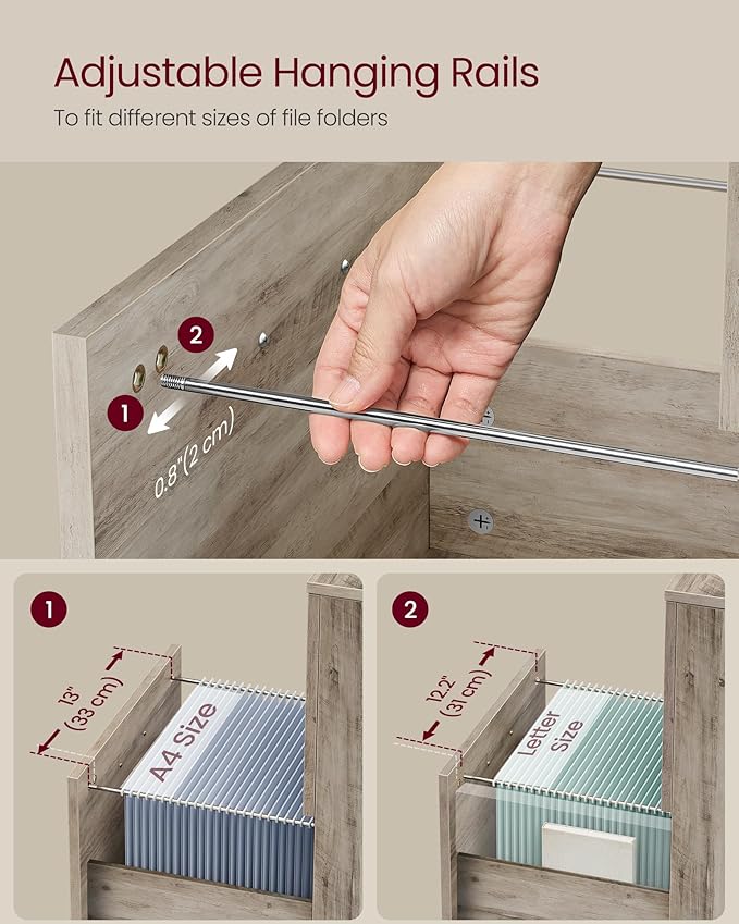 - 【PLENTY OF STORAGE】With 2 spacious drawers, this file cabinet can neatly store 90-130 sheets of documents in each, meeting your daily filing needs. Adjustable hanging rails inside the drawers fit both A4 and letter size folders