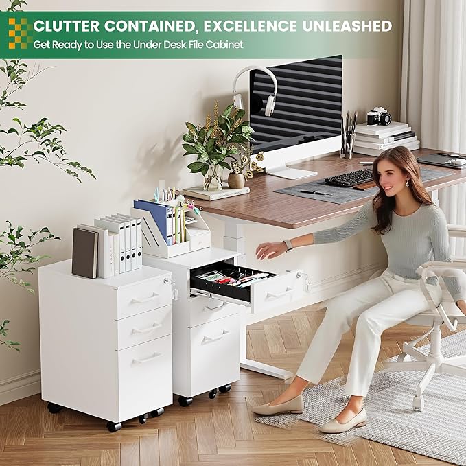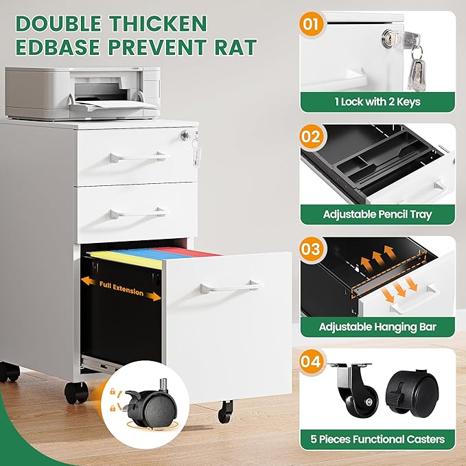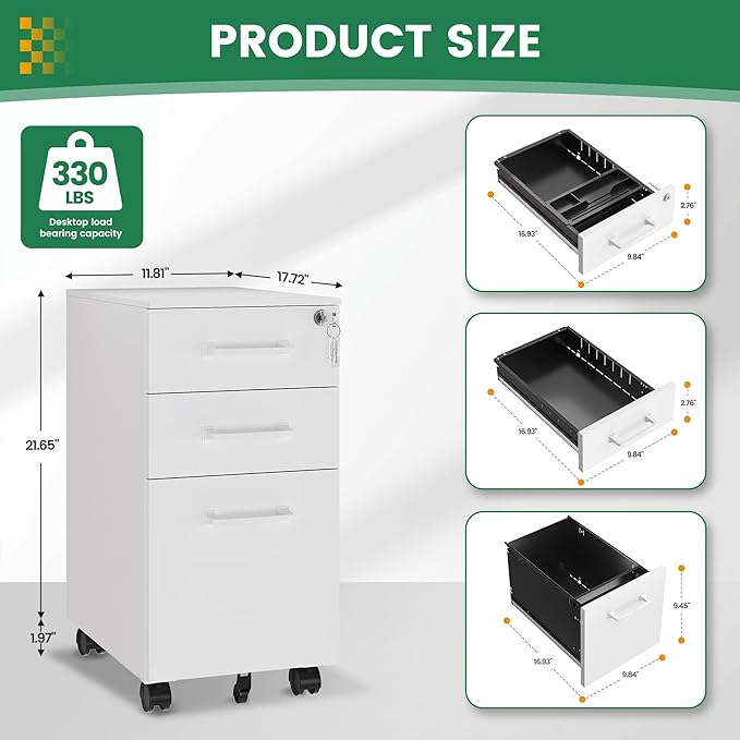 - 【Filing Cabinet with Lock 】 This small filing cabinet with a built-in lock that secures all three drawers, keeping your personal documents, receipts, important papers and bills in safe and organized. It is better to keep 2 keys separately in case of losing