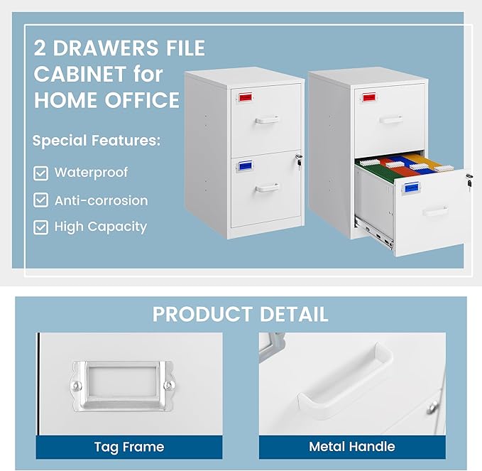 - 【Ample Storage & Sleek Design】This 2-drawer filing cabinet offers generous space for letter or legal-sized files, folders, and office supplies. Its compact vertical footprint (15"W x 17.71"D) saves valuable floor space, making it ideal for any home office or workspace.