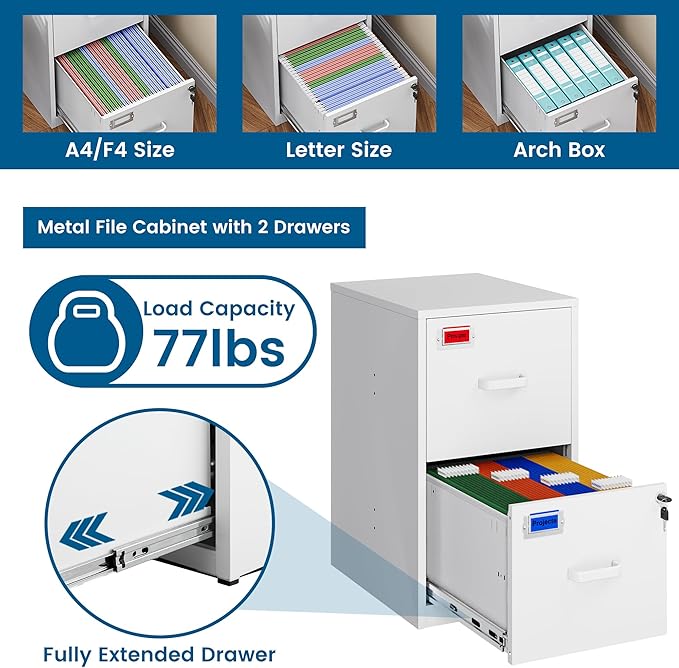 2 Drawer File Cabinet with Lock, 25.4" High Vertical Filing Cabinet, 17.7" Deep Metal Storage Cabinets for Home Office, Letter/Legal/A4/F4 Size, White(Assemble Required)