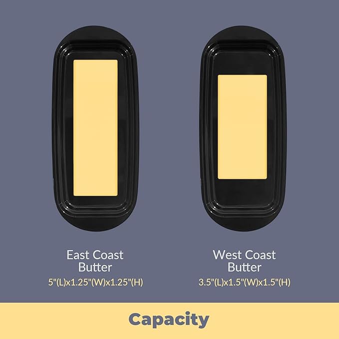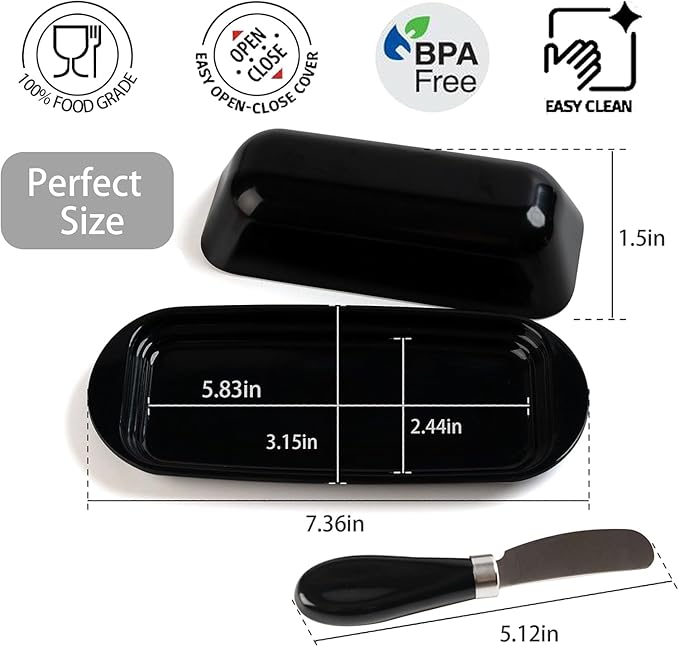 - Perfect Fit: Designed for standard East and West Coast butter sticks (base: 7.36" x 3.15" x 0.55", lid: 5.83" x 2.44" x 1.5"), this butter dish keeps butter secure, mess-free, and fresh on your countertop or in the fridge