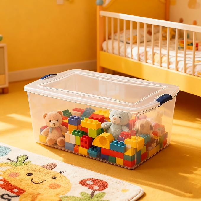 - Clear Visibility & Secure Latches: Fully transparent base and lid let you spot contents instantly—no need to open or rummage through bins. Bold blue latches lock the lid tight, keeping your items dust-free and secure.