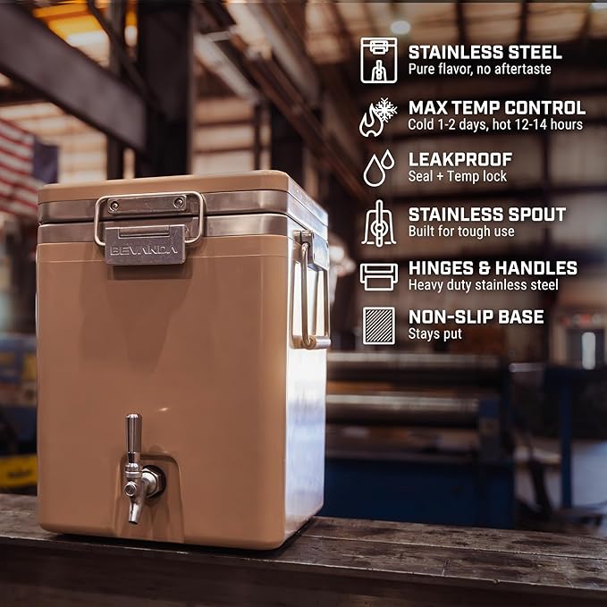 - DURABLE STAINLESS STEEL DRINK DISPENSER: Built for longevity, our insulated beverage dispensers are made from rust-resistant, corrosion-proof stainless steel. This large, leak-proof drink dispenser build prevents unwanted spills, ensuring mess-free serving. Perfect for parties, camping trips, and other outdoor events, it keeps hot and iced beverages fresh for hours! This insulated stainless steel dispenser with spout is designed for indoor and outdoor activities, including home and commercial use.