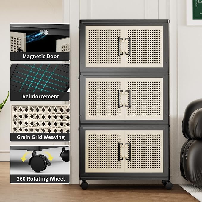 Stackable Storage Bins with Lids,Collapsible Plastic Storage Box Closet Organizers and Storage with Wheels and Magnetic Door for Home Office Dorm (3 Pack)