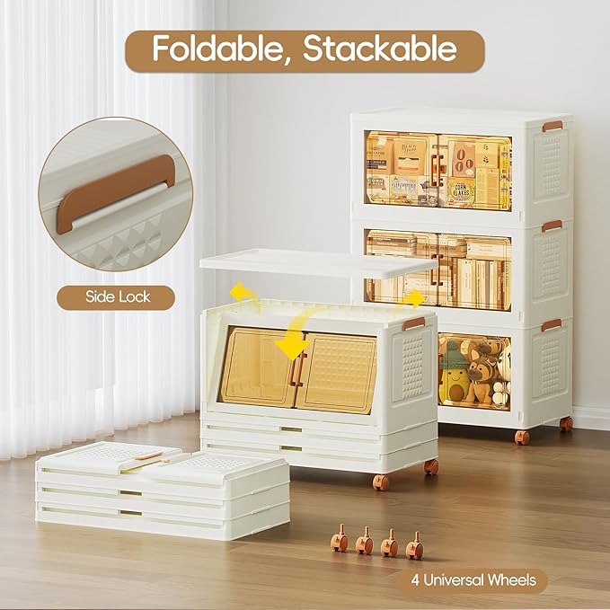 - Space-Saving & Easy to Move: Folds flat for compact storage when not in use. Side buckles keep the bins securely locked for stable stacking, and four smooth 360° wheels allow effortless movement around your home.