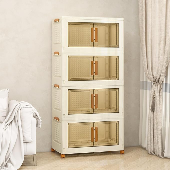 Plastic Stackable Storage Bins with Lids and Wheels, Foldable Storage Containers, Collapsible Clear Storage Cabinet with Doors White 4Tiers 148.8QT